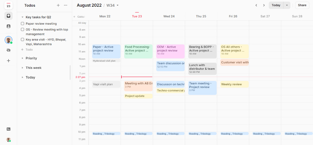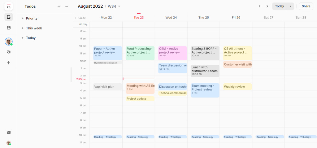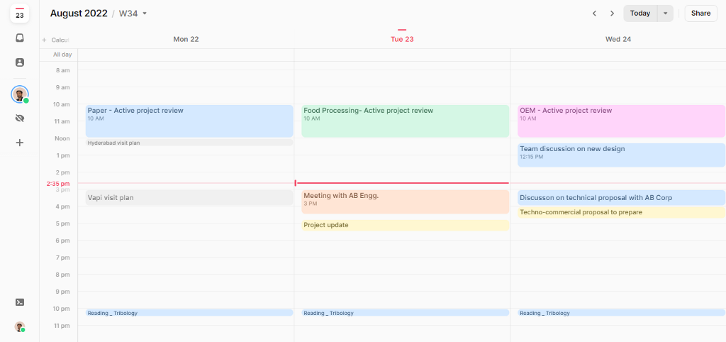 I am using Orange for customer visit and Blue for offline or online team meeting and Yellow for my reports and reviews.