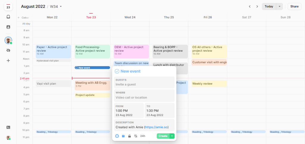 Core task of the Calendar is to help you plan better and Scheduling with Amie is a pleasant and fast experience.