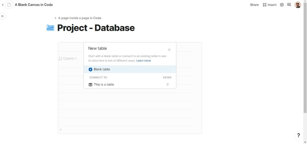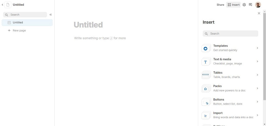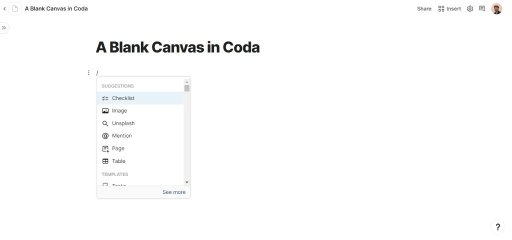 Coda offers a blank canvas and you can directly open a new doc in the browser just by: Coda.io/newdoc kind of a hotkey. You can use left sidebar menu for quick access of templates, text & media, tables and so many other options.