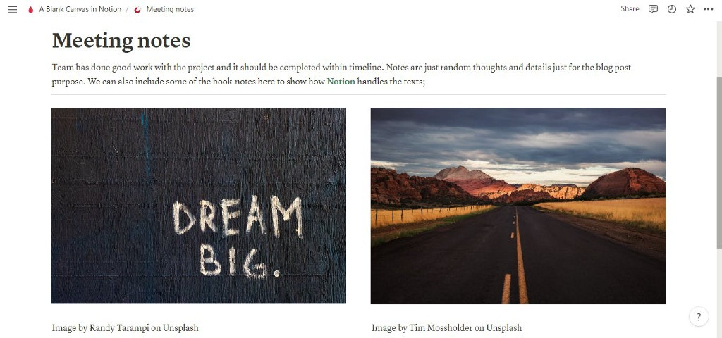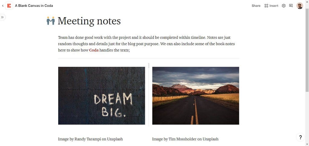 The experience of text and image handling in Coda & Notion is very similar, the major difference is Notion allows you to export in PDF, HTML, Markdown & CSV file whereas Coda allows you to present the page with option to export in PDF.