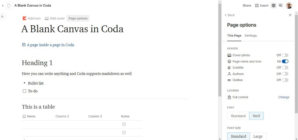 In Notion settings menu offers change in fonts, text size and width with some other options like lock or customize page whereas in Coda; settings menu opens option of automation, doc stats, page lock and page settings of fonts, text size and alignment with page specific settings.