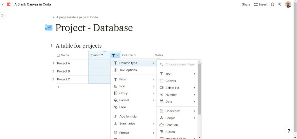 While working with Coda feels more solid with its in built Canvas property which handles your brief notes of that column, also Coda offers more options of property to make use of its automation ability with buttons, reactions and also in conditional formatting and in built chart view.