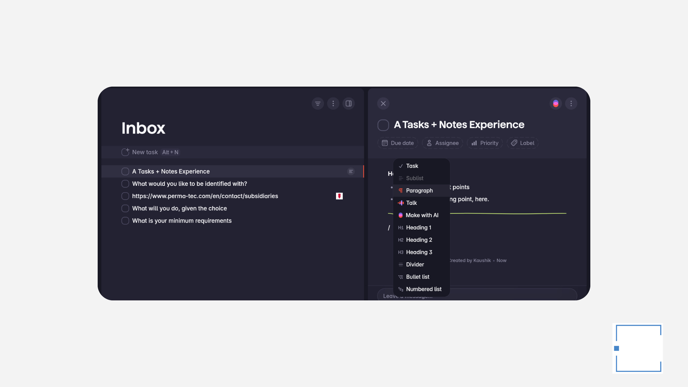 Tasks and notes live together. This is the killer feature for me. My work involves a lot of context-switching: different teams, different projects, meeting notes, follow-ups. Before, I was bouncing between my task manager and a notes app constantly. Now everything lives in one place. A task can hold detailed notes. A note can spawn tasks. It just... flows.
